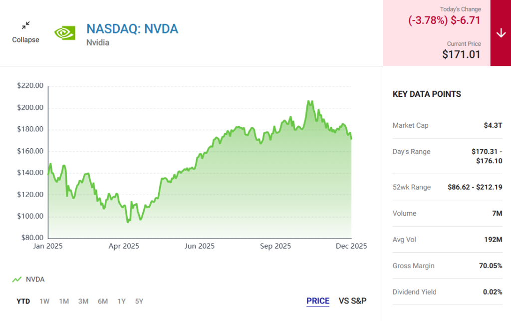 Importantly, valuation does not appear stretched relative to growth. NVIDIA trades at less than 24 times forward 2026 earnings and carries a PEG ratio near 0.6, a level typically associated with undervalued growth stocks. With demand visibility remaining strong and AI adoption still in early stages, Nvidia looks well-positioned to extend its rally into 2026.