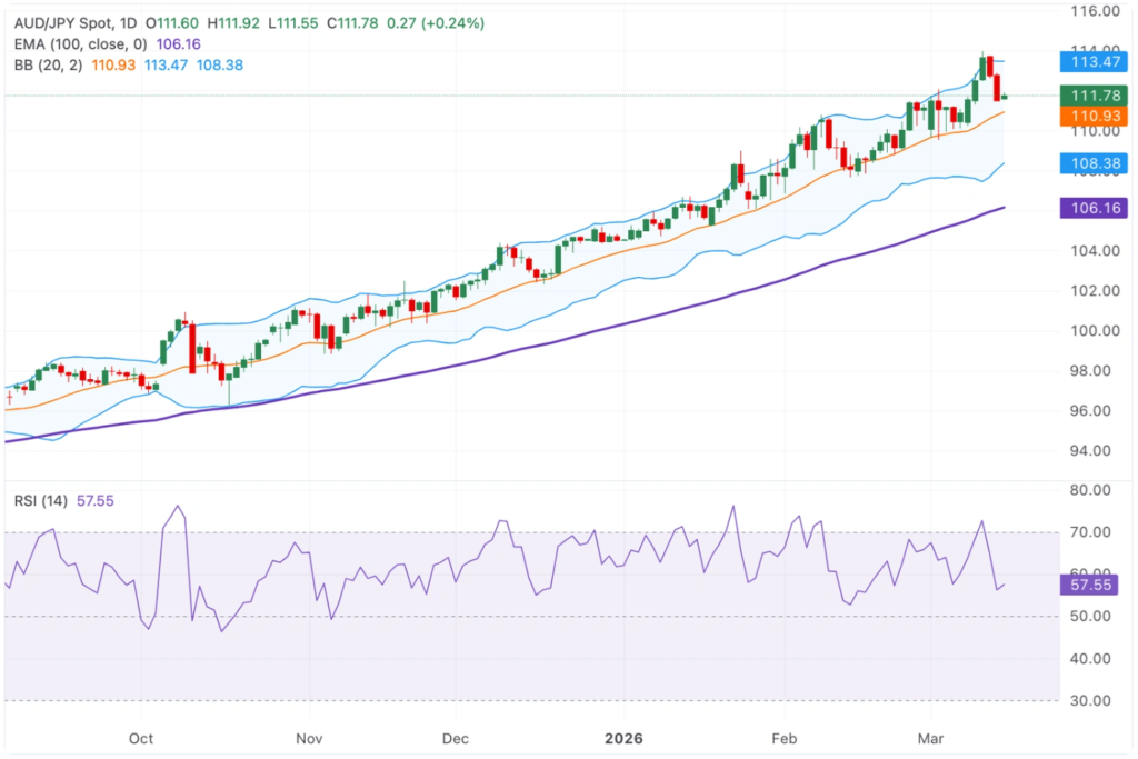 While the focus remains on NZD/USD, the AUD/JPY cross provides a useful proxy for risk appetite in the Asian-Pacific complex. On Monday, the AUD/JPY traded higher near 111.70 in the early European session, reflecting an overall positive tone. This movement aligns with the cross remaining well above the rising 100-day EMA, a critical technical support level, signaling that the medium-term bullish trend remains intact.