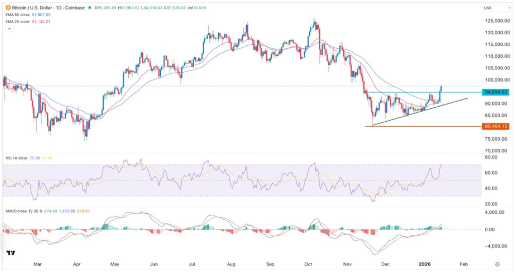 From a technical analysis perspective, the daily chart paints a compelling bullish picture. The BTC/USD pair has remained in a clear uptrend over the past few months, rising steadily from $80,465 in November to the current $97,500 level.