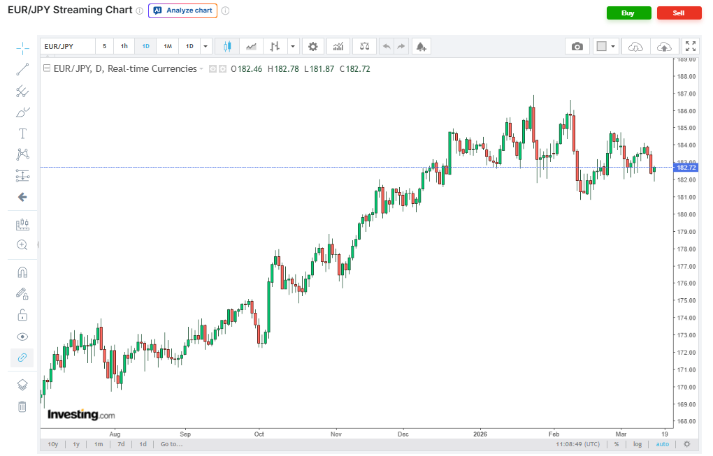The EUR/JPY currency pair stabilized near 182.40 in early trading, pausing after two consecutive sessions of decline as the Euro regained modest traction against several major currencies. The pair’s ability to steady reflects improving geopolitical sentiment in global markets, although investors remain cautious due to the possibility of policy shifts and currency intervention risks.