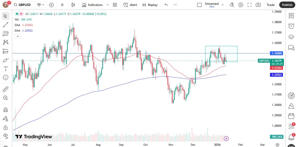 The British pound showed early strength on Wednesday, briefly signaling bullish momentum. That advance, however, lost steam as the price approached the 1.35 level, a key psychological threshold closely tracked by traders, institutions, and trading algorithms.