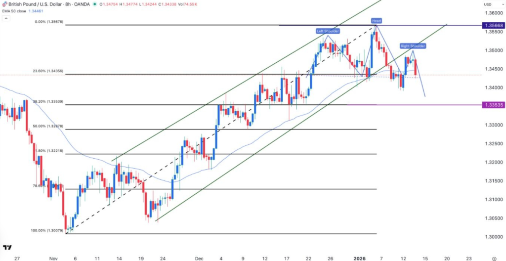 From a technical perspective, the outlook for GBP/USD has deteriorated noticeably. In the eight-hour timeframe, the pair has pulled back sharply over the past two weeks, falling from a January 6 high of 1.3566 to around 1.3435.