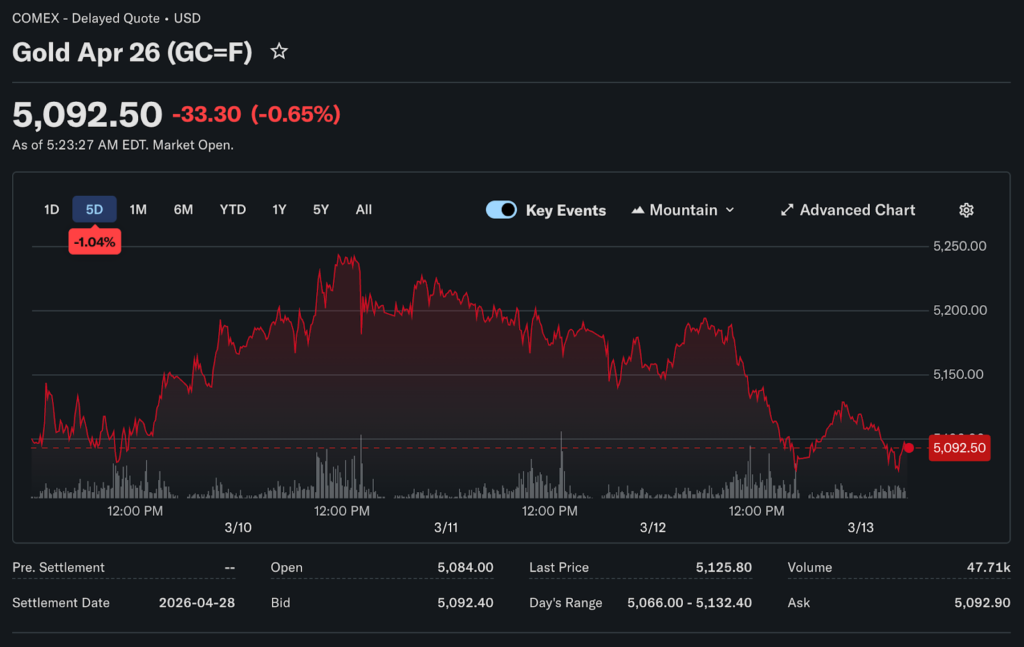 Gold’s current level above $5,200 represents an extraordinary run from where it stood before the Middle East conflict escalated. Spot gold had surged to a brief peak of $5,419 per ounce in early March as the initial fear trade kicked in, before settling slightly lower as the dollar strengthened and some tactical selling emerged. Even at current levels, the move since late February represents one of the fastest gold price accelerations in recent memory.
