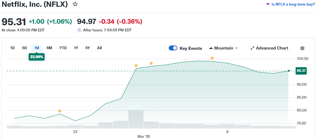 Following news of the acquisition, Netflix shares declined approximately 0.6 percent, though the stock still performed better than the broader market during the session.