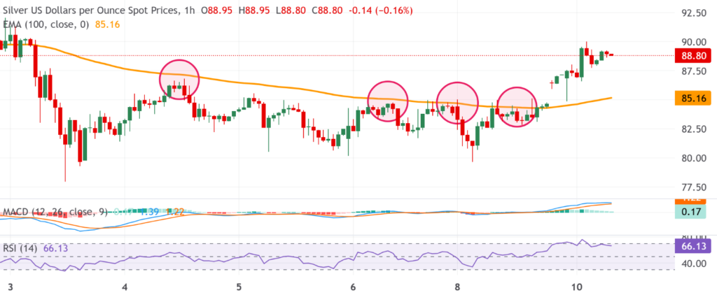 The overnight breakout above the 100-hour Exponential Moving Average (EMA) acted as a critical trigger for bullish momentum in XAG/USD. This breakout preserved the short-term uptrend, despite a mild corrective pullback that followed the initial surge. Traders often monitor the 100-hour EMA as a dynamic support/resistance zone, and the recent breach above it underscores the strength of buyer interest.