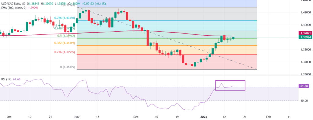 A sustained break above 1.3909 could pave the way for a test of 1.4000, which is a significant psychological milestone. On the downside, failure to break the 200-day EMA may result in a pullback toward 1.3850, providing traders with clear risk-reward parameters.
